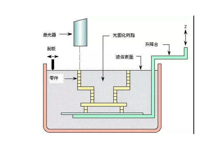 打印之前在樹脂槽中盛滿液態光敏樹脂,可升降工作臺處于液面下一個截面層厚的高度,聚焦后的激光束在計算機控制下沿液面進行掃描,被掃描的區域樹脂固化,從而得到該截面的一層樹脂薄片;升降工作臺下降一個層厚距離,液體樹脂再次暴露在光線下,再次掃描固化,如此重復,直到整個產品成型;升降臺升出液體樹脂表面,取出工件,進行相關后處理,通過強光、電鍍、噴漆或著色等處理得到需要的最終產品。